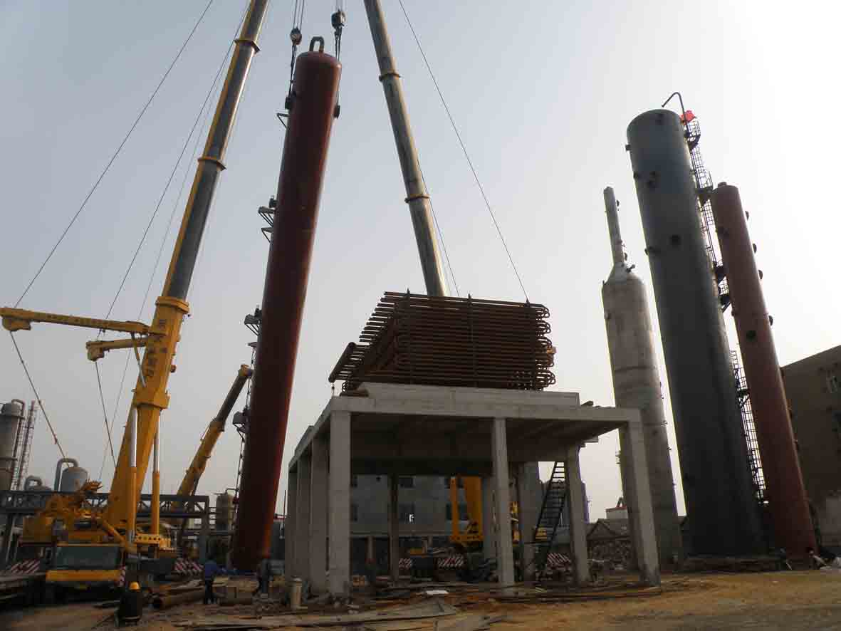 2012年4月28日,我公司脱碳技术改造工作中吨位最大、起吊安装难度最大的二氧化碳吸收塔和闪蒸洗涤塔、洗涤塔三台设备成功实现安装就位。