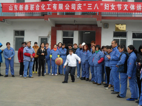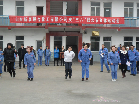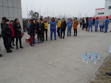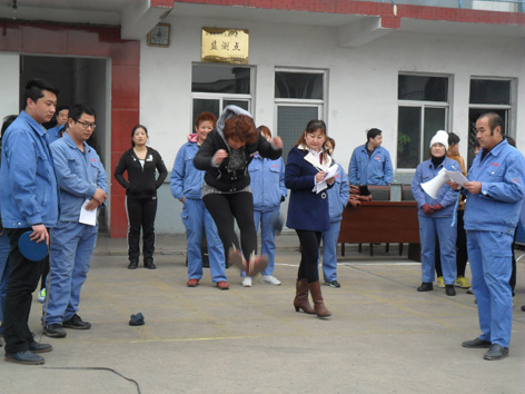 在“三八”国际妇女节到来之际,为丰富节日期间广大女职工的业余文化生活,活跃节日气氛,展现女职工爱岗敬业、健康向上的精神面貌,公司于3月8日上午在办公楼前举办了文体娱乐活动,子公司新泰公司也同时举办了相关庆祝活动,总公司活动现场设置了趣味保龄球、定点套圈、沙包投准、摸石过河等四个项目,共9个代表队68名选手参加了比赛。新泰公司共5个代表队45名参赛选手参加了“ 双脚跳远” “脚扔沙包”及“趣味保龄球”三个项目的比赛,比赛结束后,对获奖人员进行了现场颁奖。(图为比赛现场)