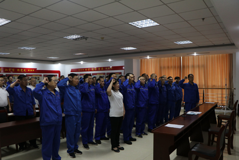 宣誓仪式在庄严的《国际歌》声中拉开了帷幕。2020年度和2021上半年度新发展的17名预备党员面对鲜红的党旗,在党委书记李德军同志领誓下,右手举拳,神情肃穆,郑重宣誓。宣誓完毕后,老党员代表郭章雷和新党员代表东明明分别作了发言。公司党委书记李德军代表公司党委向新发展的预备党员表示了祝贺,并对新党员提出了希望和要求