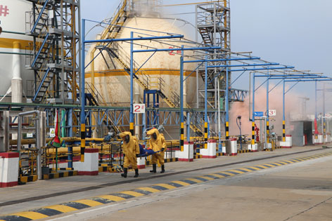 上午9时整,公司总经理李峰宣布公司2022年度生产安全事故综合应急救援演练正式开始。演练模拟的事故情景为2#液氨球罐出口阀前管线发生泄漏,1名巡检人员手臂灼伤,撤离过程中中毒摔倒,事故影响到15万吨硝酸生产装置及周边人员生命安全,需要紧急救援。