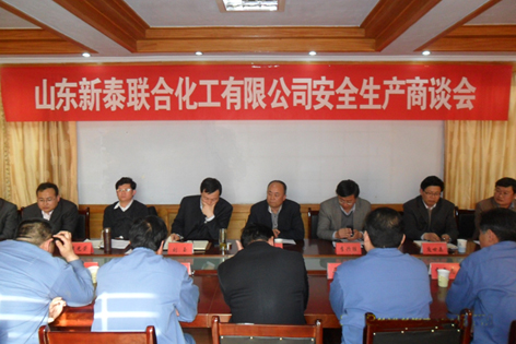 2013年4月6日,新泰市常务副市长刘玉、新泰市安监局局长李光荣一行到新泰联合化工进行调研,并组织召开了安全生产商谈会。楼德镇镇长李兴胜、公司董事长王宜明、总经理庞世森、新泰联合化工高层管理人员及车间、安全、技术等部门主要负责人参加了会议。