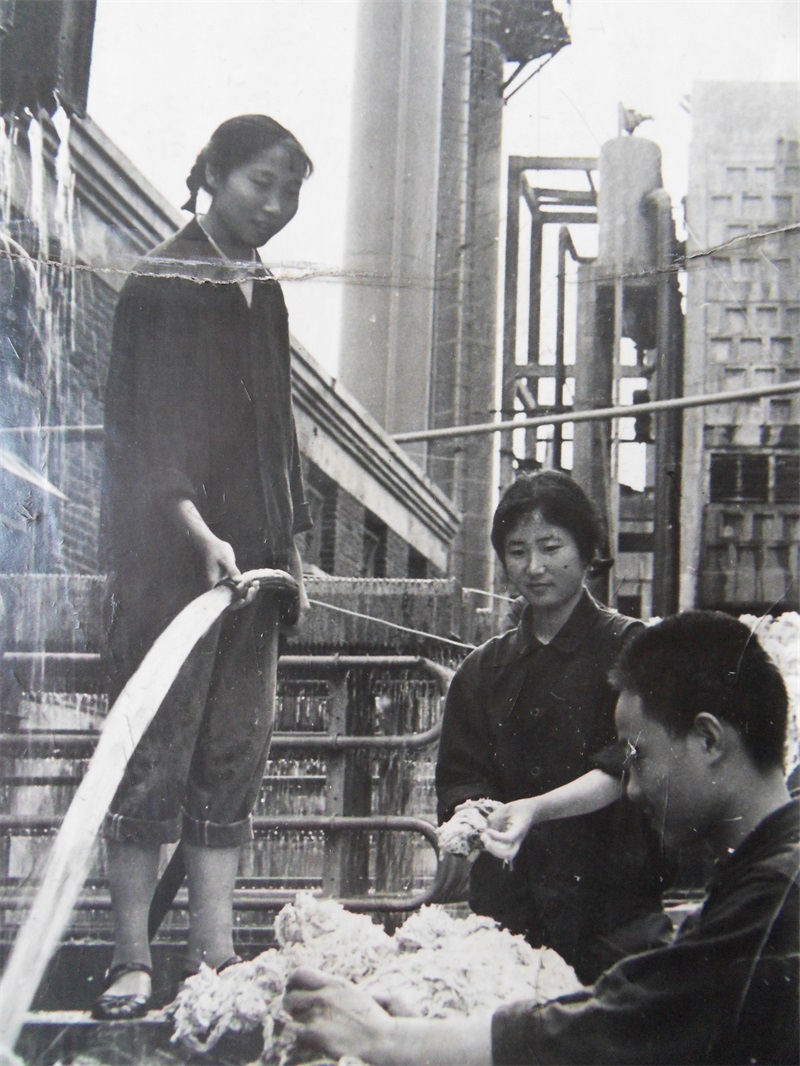 合成车间压缩工段的职工利用业余时间回收清洗旧棉纱