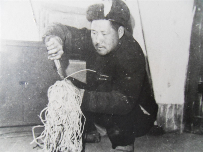 硝铵车间工段长武传平利用旧麻绳、布条制作拖把