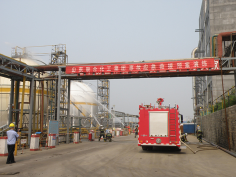 为检验公司危险化学品事故状态应急处置能力,加强对重大危险源的管理,防止危化品泄漏造成火灾、爆炸、伤亡以及环境污染事故发生,公司于628日上午在东厂区液氨罐区举行了液氨泄漏应急救援演练。县政府领导、县安监局、环保局、消防大队、卫生局、县内其他危化品企业和公司领导及部分员工观摩了本次演习。演练现场模拟东部生产区液氨罐区1000立方米液氨球罐出口管线突然发生液氨泄漏,按照公司《生产安全事故综合应急救援预案》要求,公司实施了应急救援全过程演练。